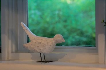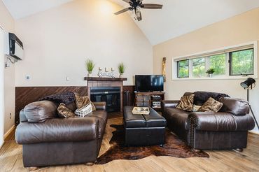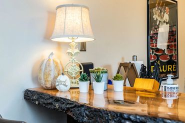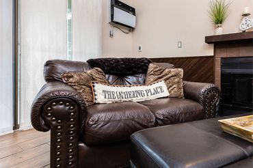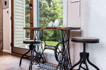 You come to the mountains because you love nature so we've surrounded you with comfy leather sofas, handcrafted live edge breakfast bar, handcrafted live edge side table created on an antique singer sewing machine, hand-carved and handcrafted decor, and faux fur.