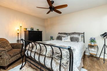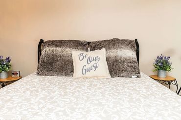 Looking for a vacation rental in the mountains? Look no more! Close your eyes and imagine opening the door to a beautifully handcrafted live edge oak breakfast bar with 4 leather bar stools, granite countertops and stainless steel appliances. As you walk into the living room, two plush, comfy leather sofas beckon you to rest & relax in front of the fireplace. Sleeps 3. Comfy wrought iron QUEEN bed for a good night’s rest! The ottoman pulls out to a TWIN bed for your third guest. There is radiant heat flooring throughout our home to pamper your feet.